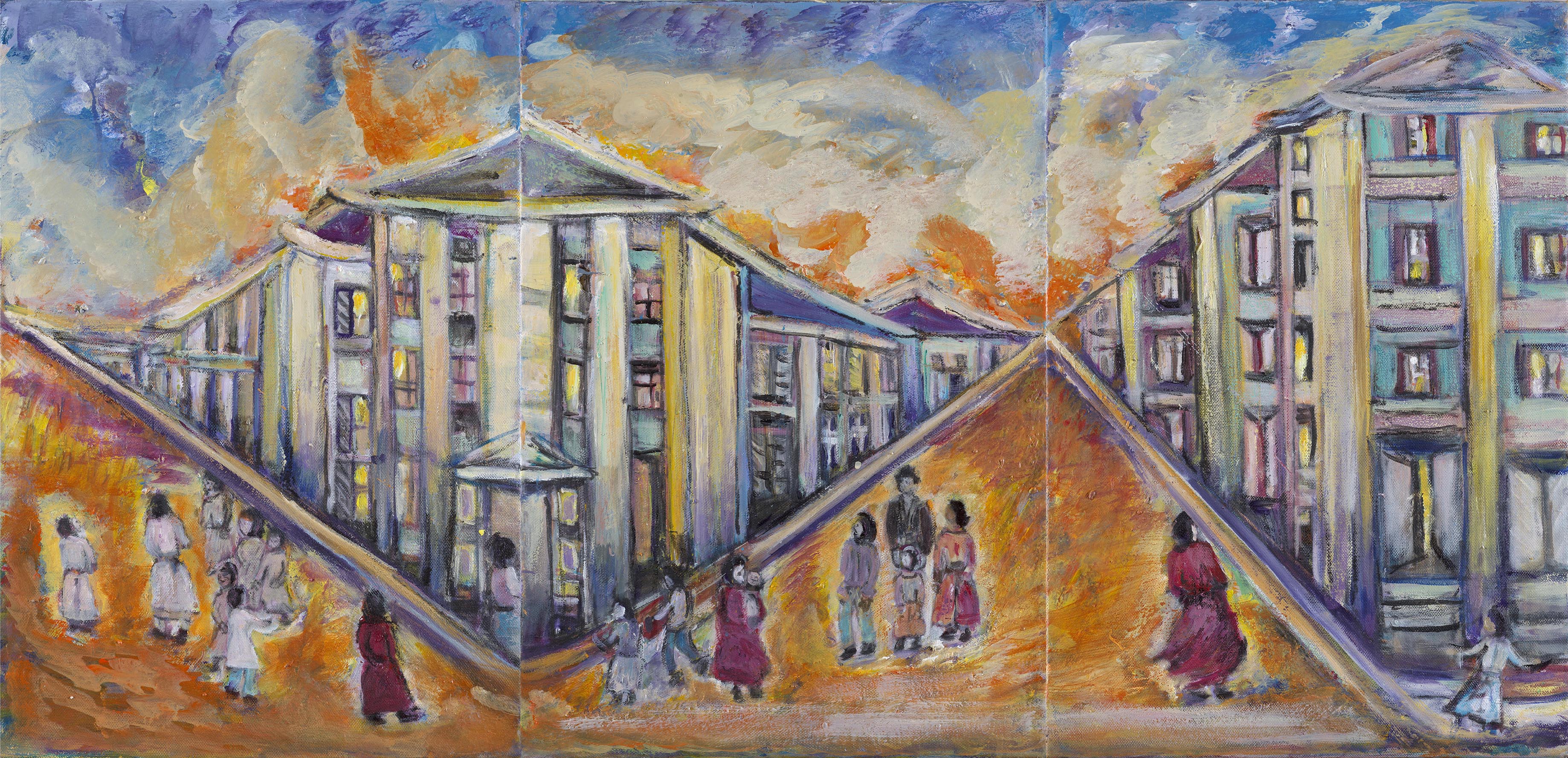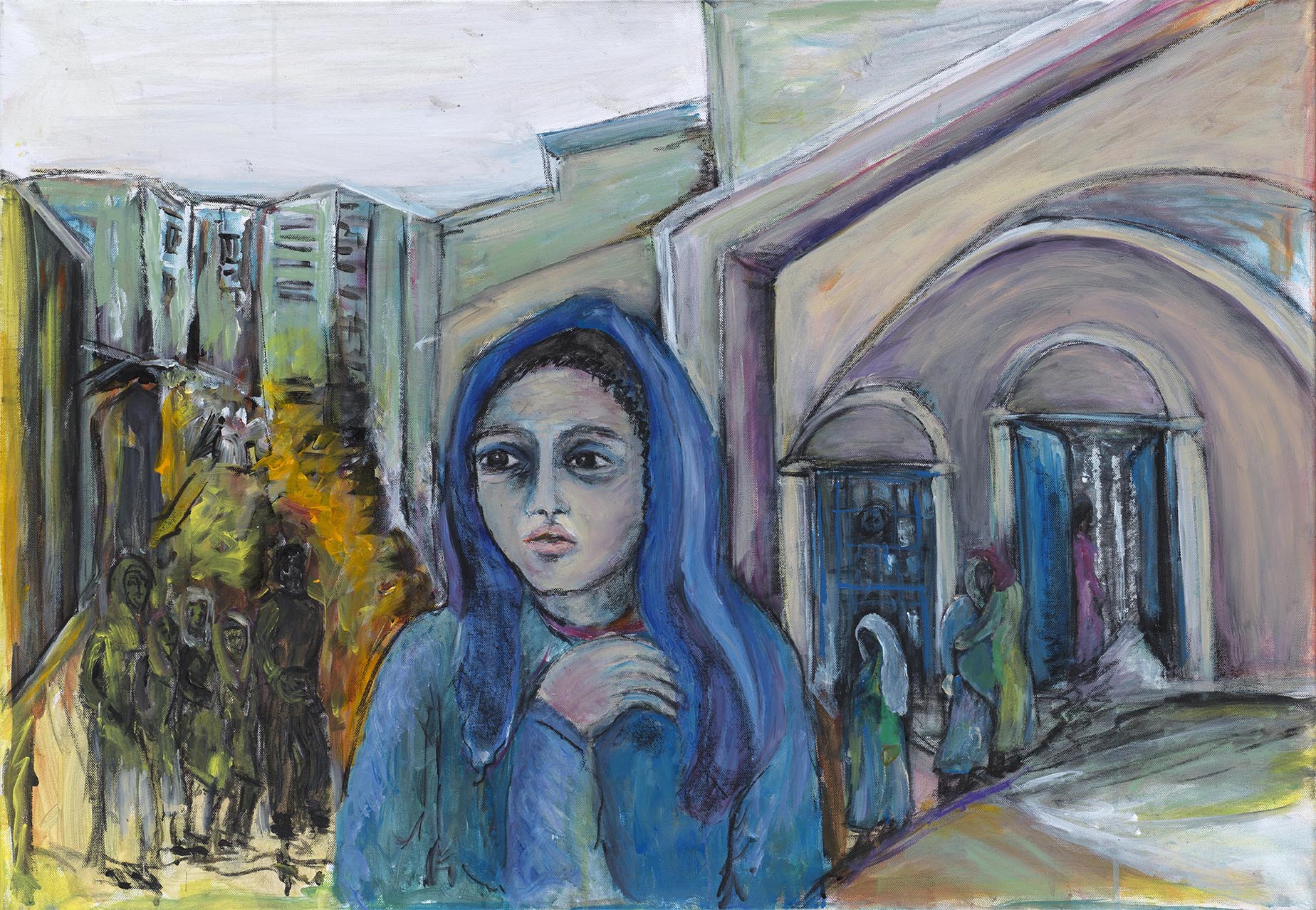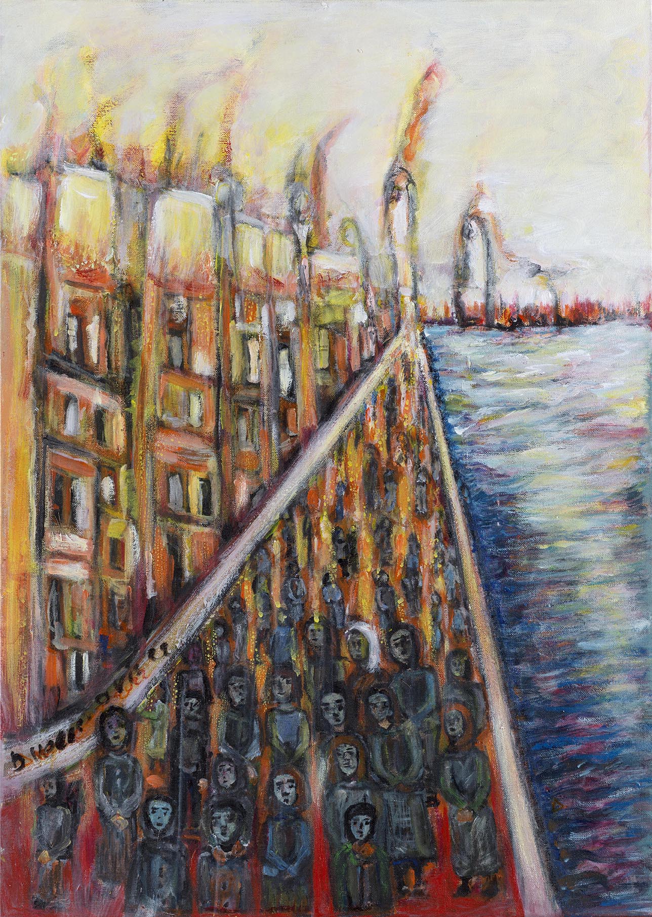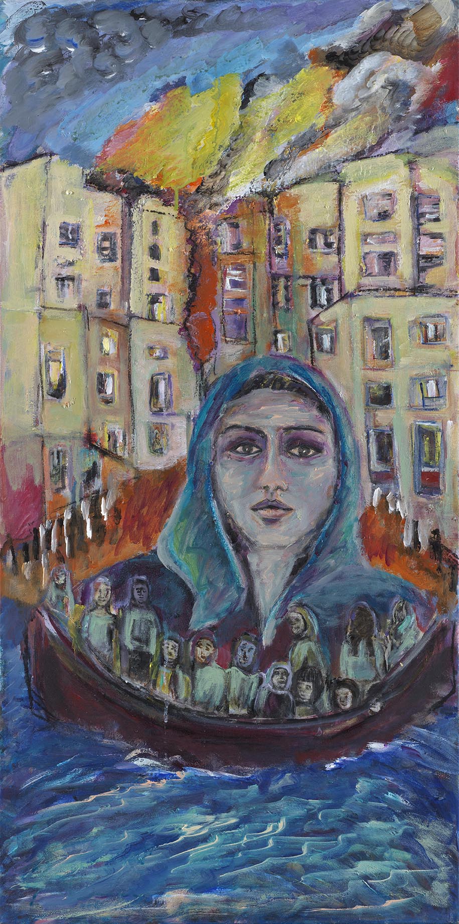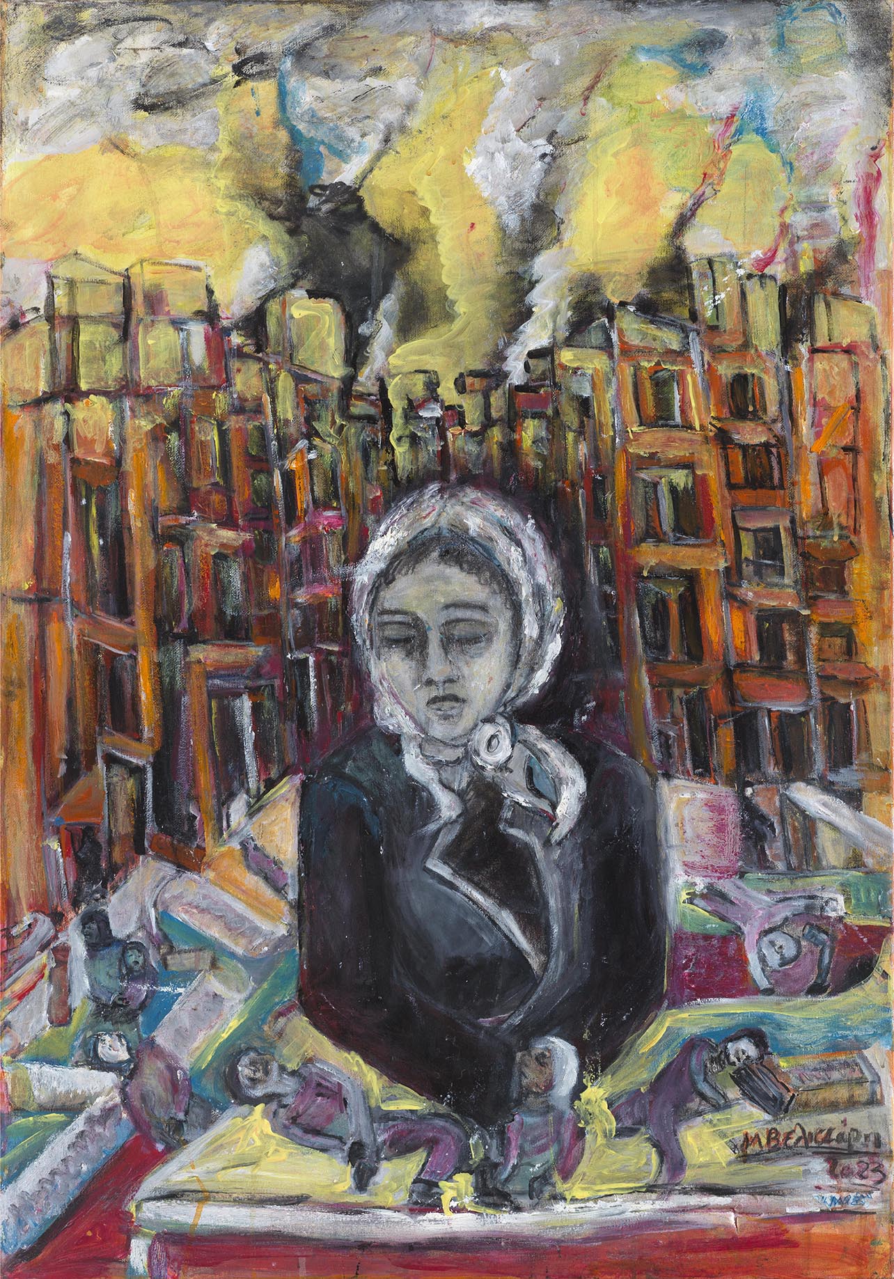 Ανάλογο είναι το σκηνικό και στην περίπτωση της Γάζας, με τη διαφορά ότι η αρχιτεκτονική, που αποδίδεται συνήθως ως πολύχρωμες κουκίδες είναι στις περισσότερες περιπτώσεις μοντέρνα και δεσπόζουν οι πολυκατοικίες, ενώ δεν απουσιάζουν και τοξωτές κατασκευές που παραπέμπουν στην Ανατολή. Οι ανθρώπινες φιγούρες είναι το ίδιο τραγικές. Και ξεχύνονται στους δρόμους της προσφυγιάς έχοντας τα παιδιά τους αγκαλιά. Τόσο στις συνθέσεις της Σμύρνης όσο και σε εκείνες της Γάζας κυριαρχούν οι γονείς, ενώ προβάλλονται οι γυναίκες. Αυτές απεικονίζονται συνήθως ημίσωμες και μνημειακές να επιβάλλονται στη σύνθεση Σε κάθε πόλεμο εκείνοι που πληρώνουν το τίμημα περισσότερο είναι τα γυναικόπαιδα και ο άμαχος πληθυσμός. Γι΄αυτό στις συνθέσεις της Δήμητρας Βελισσάρη έχουν προνομιακή μεταχείριση.