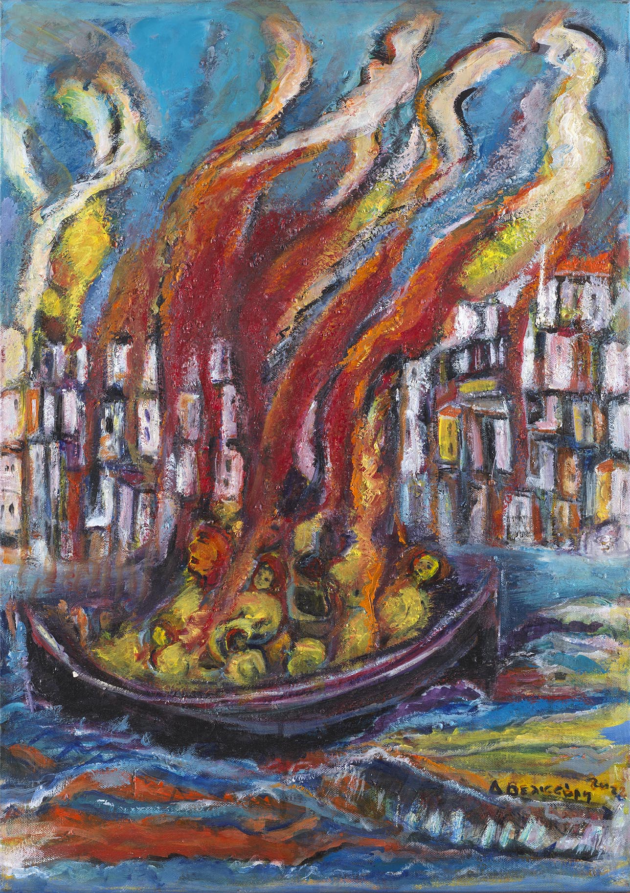“[…]Η ζωγράφος Δήμητρα Βελισσάρη, Προικισμένη από τη φύση της με πλούσια μορφοπλαστική φαντασία γονιμοποιημένη από τις σπουδές της, ιδιαίτερα κοντά στον Δημήτρη Κοκκινίδη, τον Δημήτρη Μυταρά και τον Νίκο Κεσσανλή, η Δήμητρα Βελισσάρη συνθέτει εικόνες που ενεργοποιούν το θυμικό των θεατών τους με μόνες τις μορφοπλαστικές τους αξίες, με τα σχήματα της φόρμας και προπαντός με τα πλούσια, εκφραστικά χρώματα, τα οποία απλώνει με γρήγορες πινελιές που κάνουν τη ζωγραφική επιφάνεια να πάλλεται. Αφετηριακή πηγή για να ιστορήσει με χρώματα τη θρυλική καταστροφή μιας ακμάζουσας ελληνικής πόλης στάθηκε η πυρκαγιά που μετέτρεψε τους δρόμους σε ανθρώπινα ποτάμια μέσω των οποίων απελπισμένοι άνθρωποι σπεύδουν προς το άγνωστο για να βρουν σωτηρία. […]