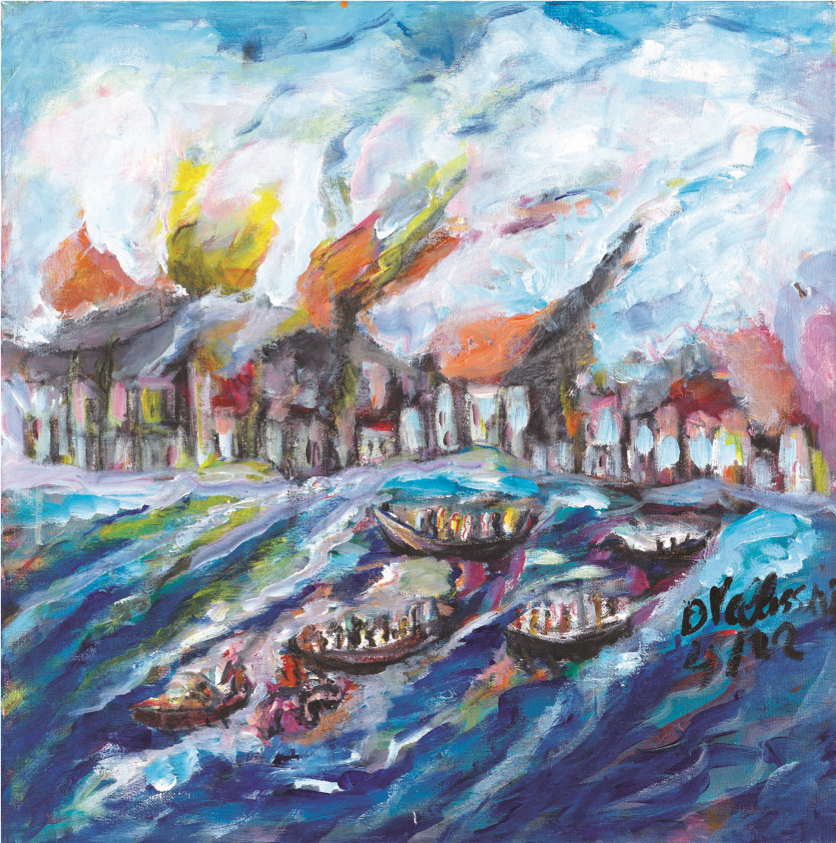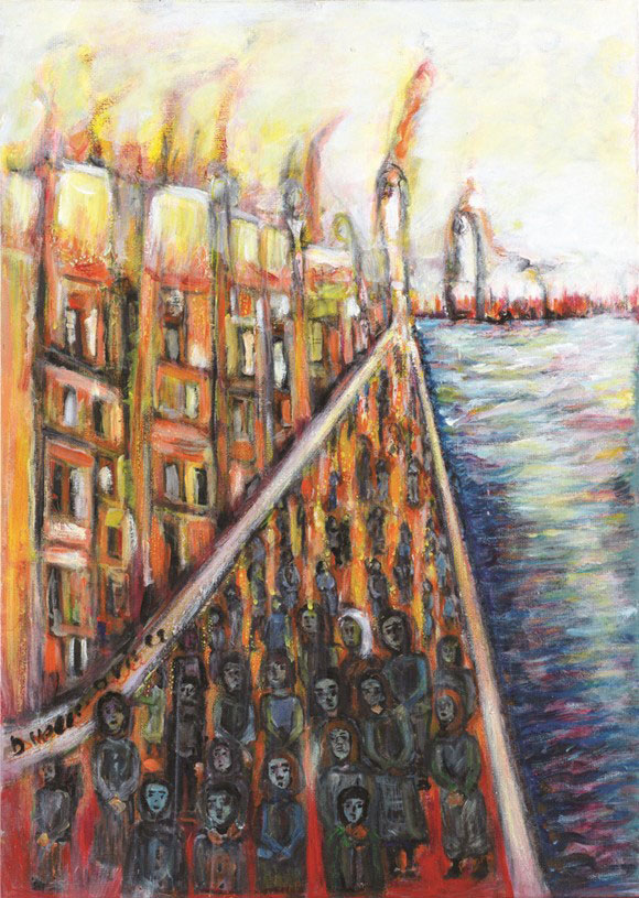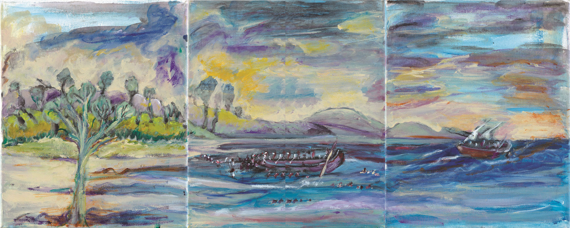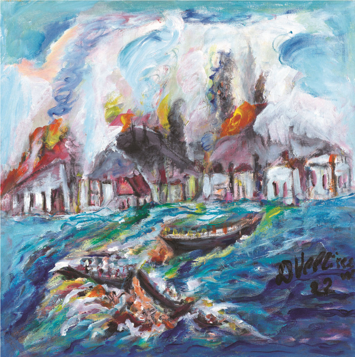 Η έξοδος από την κόλαση και η φυγή προς τη θάλασσα, όπου ελπίζουν στη σωτηρία τους είναι η άλλη εικόνα που την απασχολεί σε πίνακες, στους οποίους τα πλήθη στοιβάζονται σε βάρκες. Κάποιοι χάνονται καθ’ οδόν, κάποιοι άλλοι φθάνουν στους καταυλισμούς στην απέναντι ακτή. Και σ’ αυτή την περίπτωση επαναλαμβάνεται περίπου το ίδιο σκηνικό: Στο βάθος η πόλη και πίσω της οι τεράστιες φλόγες που αντανακλώνται στη θάλασσα και κάνουν τον ουρανό να φλέγεται. Οι μορφές αποδίδονται σχηματικά και μόνο τα τεράστια μάτια τους εκφράζουν την αγωνία και τον φόβο τους.
