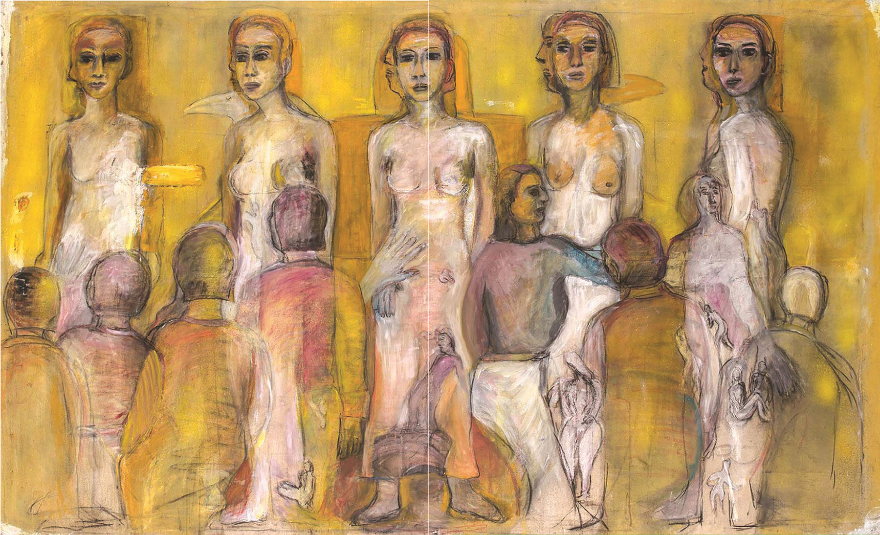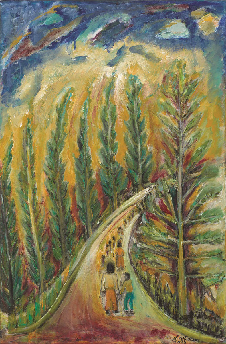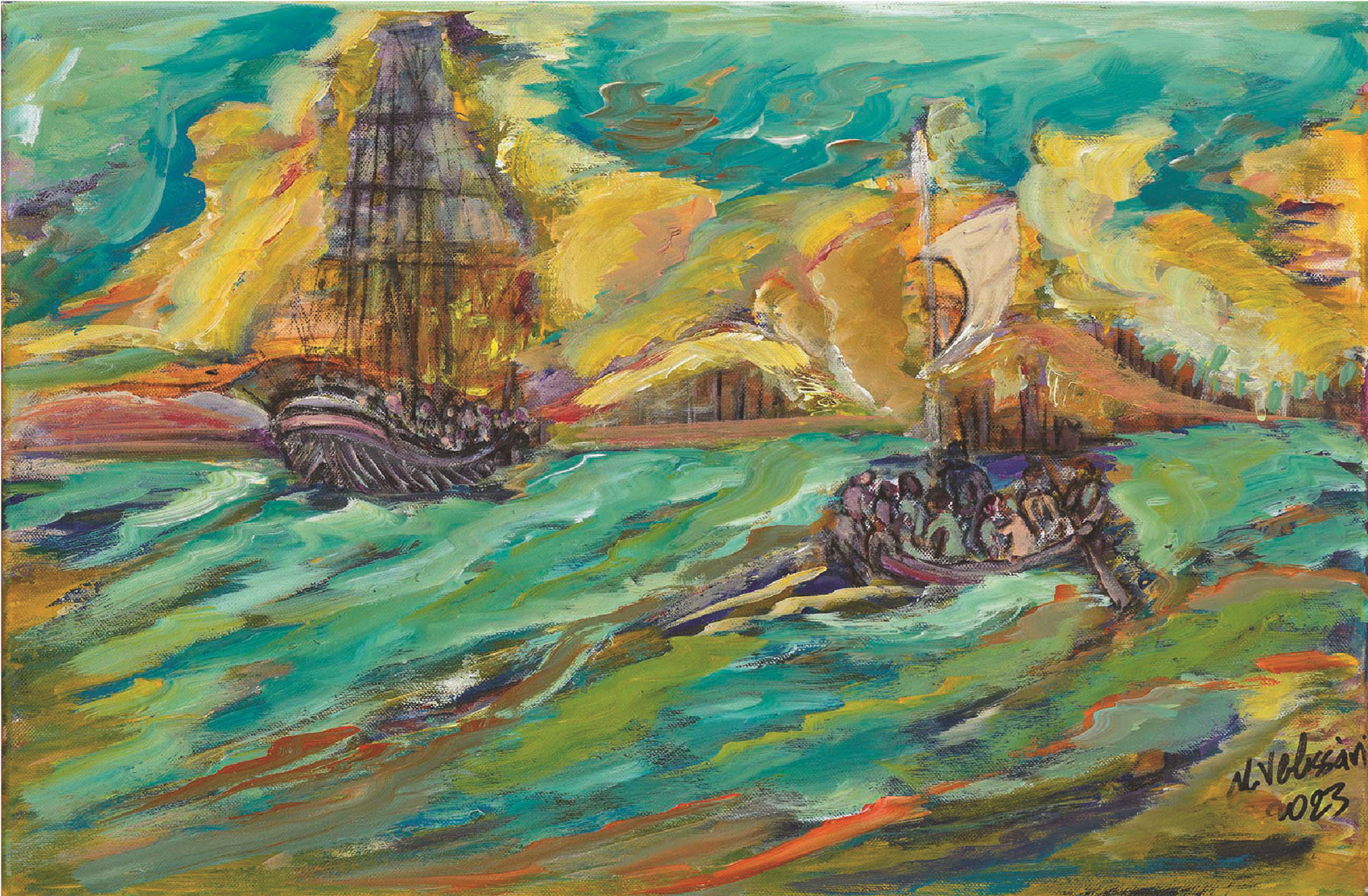Η έξοδος από την κόλαση και η φυγή προς τη θάλασσα, όπου ελπίζουν στη σωτηρία τους είναι η άλλη εικόνα που την απασχολεί σε πίνακες, στους οποίους τα πλήθη στοιβάζονται σε βάρκες. Κάποιοι χάνονται καθ’ οδόν, κάποιοι άλλοι φθάνουν στους καταυλισμούς στην απέναντι ακτή. Και σ’ αυτή την περίπτωση επαναλαμβάνεται περίπου το ίδιο σκηνικό: Στο βάθος η πόλη και πίσω της οι τεράστιες φλόγες που αντανακλώνται στη θάλασσα και κάνουν τον ουρανό να φλέγεται. Οι μορφές αποδίδονται σχηματικά και μόνο τα τεράστια μάτια τους εκφράζουν την αγωνία και τον φόβο τους.