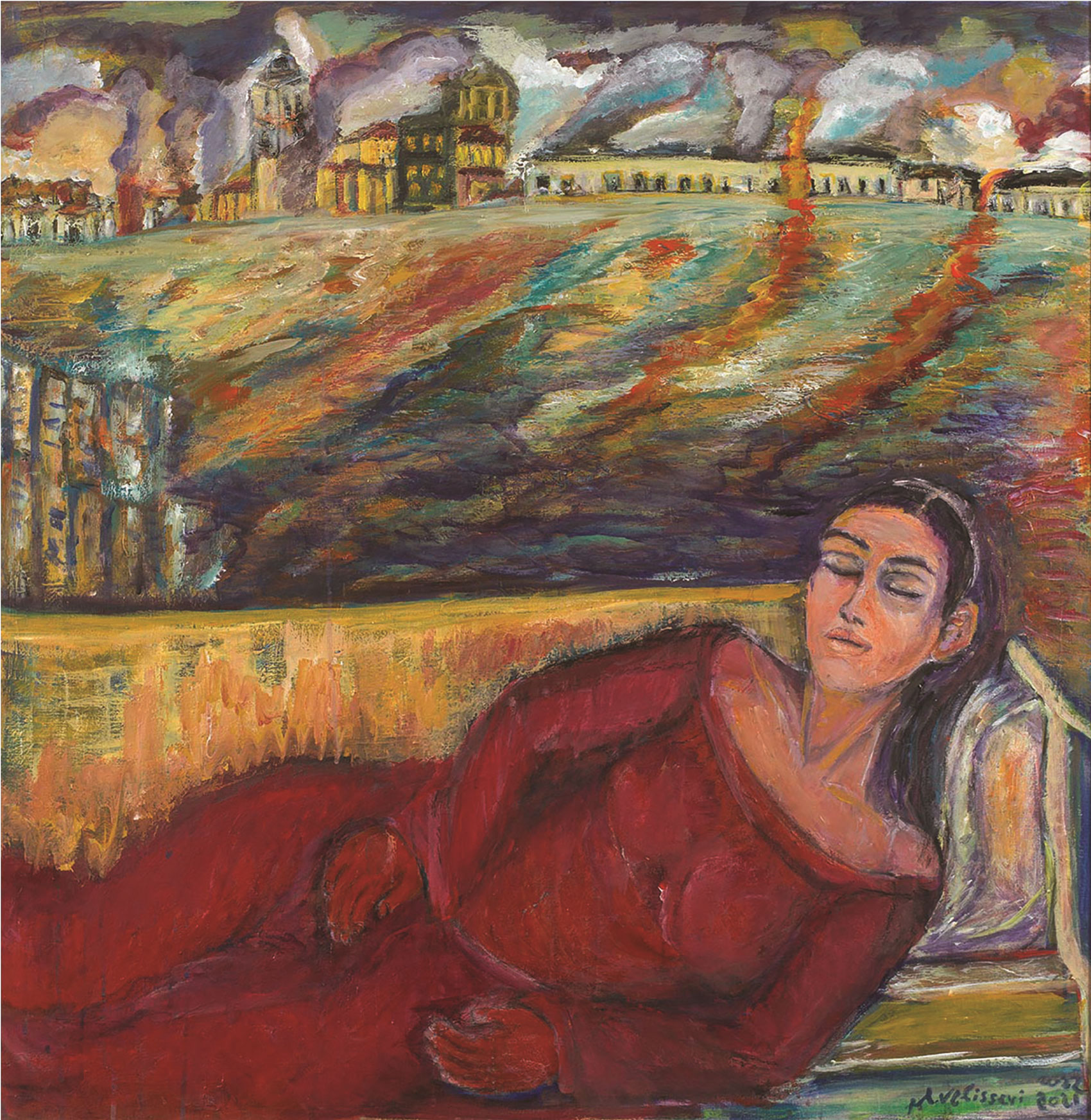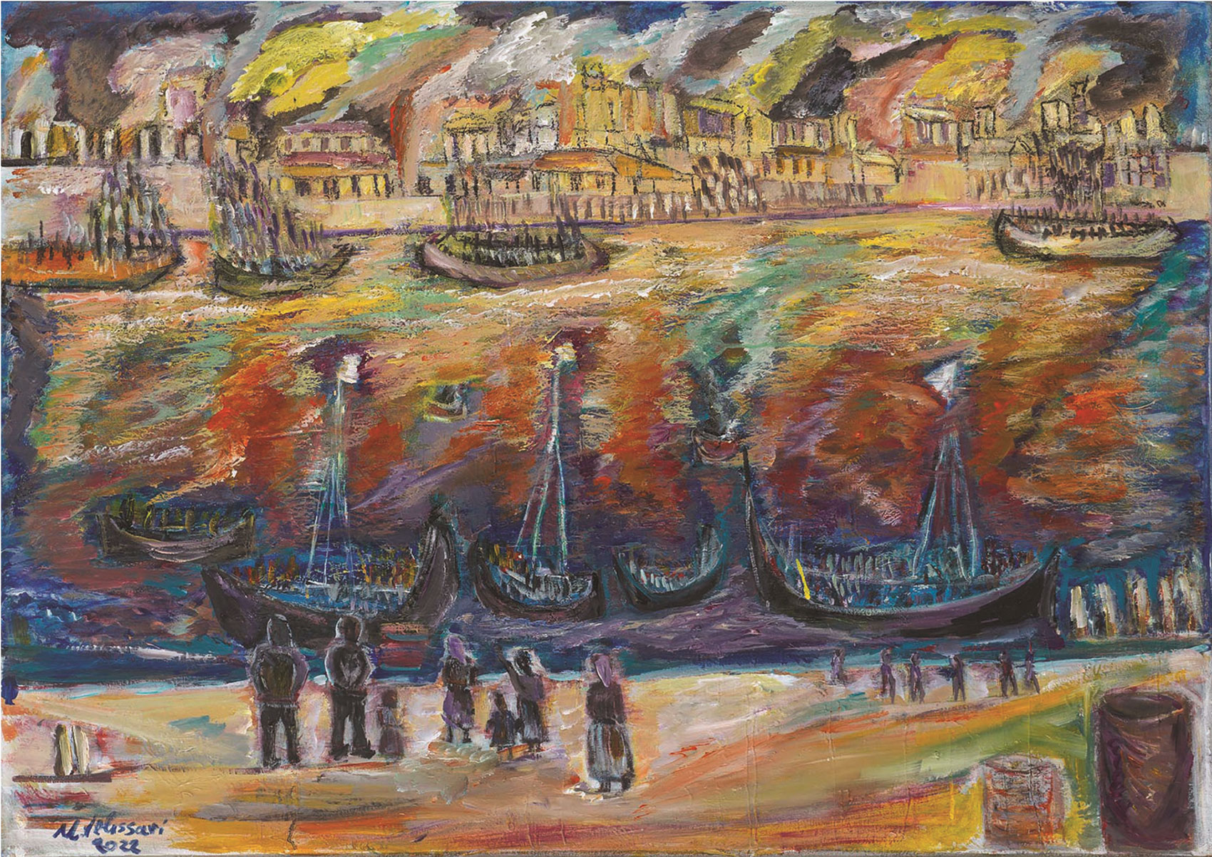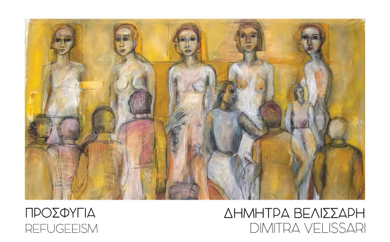 Η ζωγράφος Δήμητρα Βελισσάρη, απόφοιτος της Ανωτάτης Σχολής Καλών Τεχνών Αθηνών από το 1986, εκθέτει πίνακες διαφόρων διαστάσεων, με ακρυλικά σε καμβά ή μικτή τεχνική, από τους οποίους οι περισσότεροι φιλοτεχνήθηκαν κυρίως τα δύο τελευταία χρόνια 2023-2024. Η ζωγράφος αφορμάται από την Καταστροφή της Σμύρνης και τη βίαιη έξοδο των κατοίκων της, όσων επέζησαν των σφαγών, προς την προσφυγιά και τη σωτηρία. Συγχρόνως όμως συγκινείται και από ένα σχεδόν πανομοιότυπο δράμα που εξελίσσεται στις μέρες μας στη Λωρίδα της Γάζας, όπως αυτό προσφέρεται στο κοινό από τα Μέσα Μαζικής Επικοινωνίας μέσω αποτρόπαιων σκηνών, εικόνων και περιγραφών. Συνειρμικά είναι αναπόφευκτο η μνήμη να στραφεί και προς άλλες περιπτώσεις προσφυγιάς, όπως το δράμα της Κύπρου μετά την τουρκική εισβολή το 1974. Έτσι ο συνειρμικός νόμος της ομοιότητας ανακαλεί το παρελθόν και το συνθέτει με το τρέχον παρόν, προσφέροντας στη σκεπτόμενη ζωγράφο την ευκαιρία να υψώσει την αντιπολεμική κραυγή της, ζυμωμένη με το «αίμα» της ζωγραφικής: τα χρώματα, πλούσια και φωτεινά, ως αντίστιξη στη ζοφερή πραγματικότητα και στο αίμα των ανθρωποθυσιών αλλά και ως αισιόδοξο μήνυμα σωτηρίας.