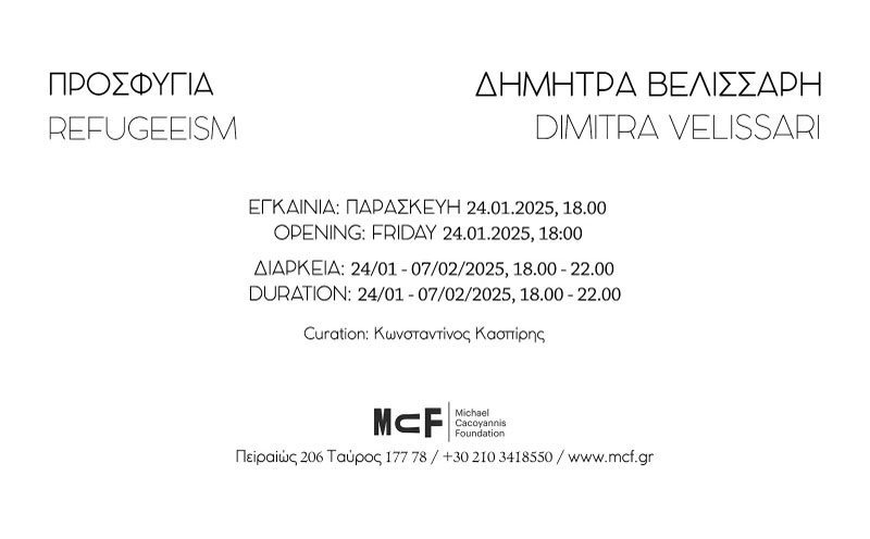 Το Ίδρυμα Μιχάλης Κακογιάννης (Λεωφ. Πειραιώς 206) παρουσιάζει την έκθεση ζωγραφικής της Δήμητρας Βελισσάρη, με τίτλο «Προσφυγιά», από τις 24/1 έως τις 7/2/2025.