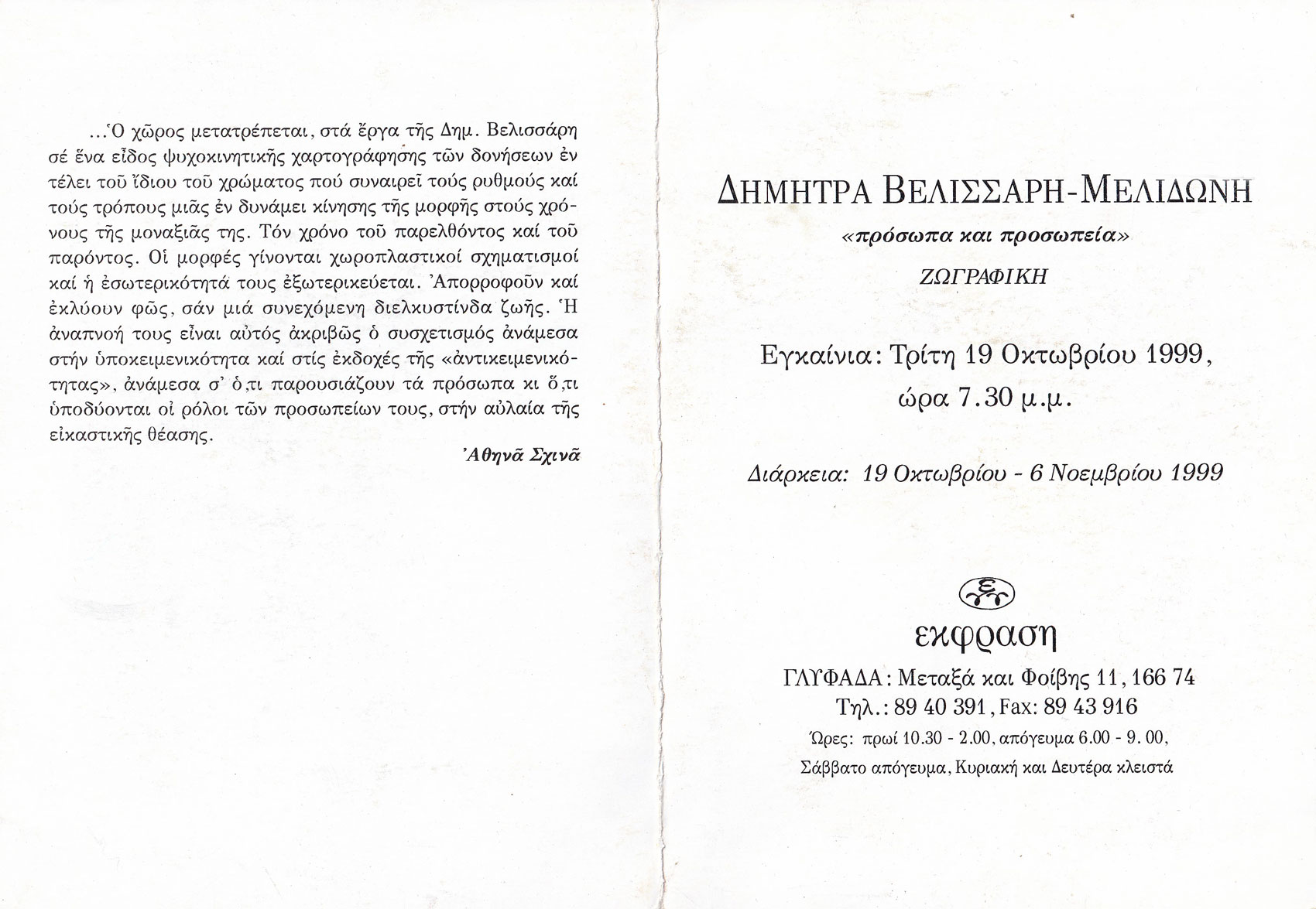 1999 – Αίθουσα Τέχνης «Έκφραση» Γλυφάδα – Πρόσωπα και Προσωπεία